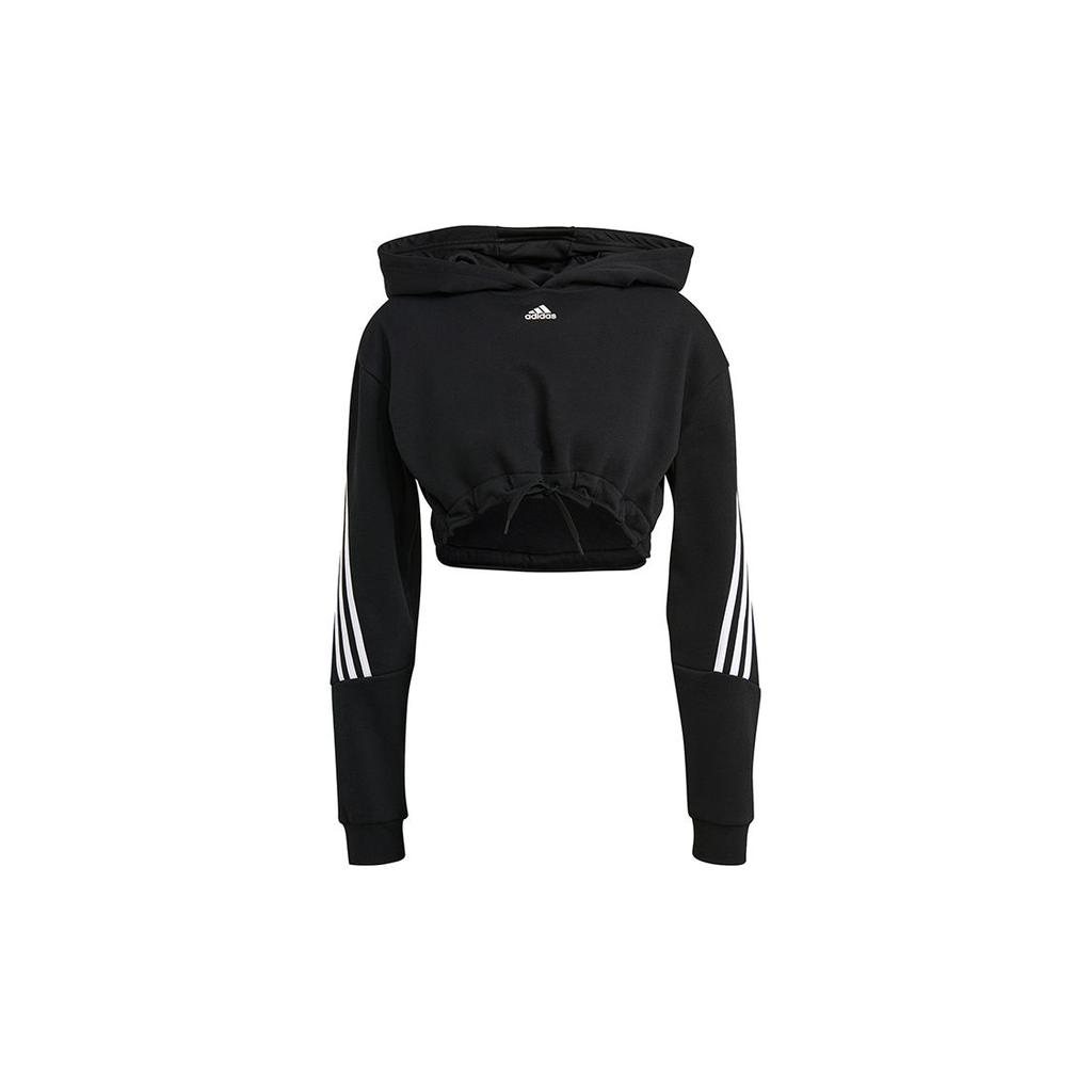 adidas Crop Hoodie Casual Sport Striped Training Pullover Sweatshirt Women Tops Black H47479
