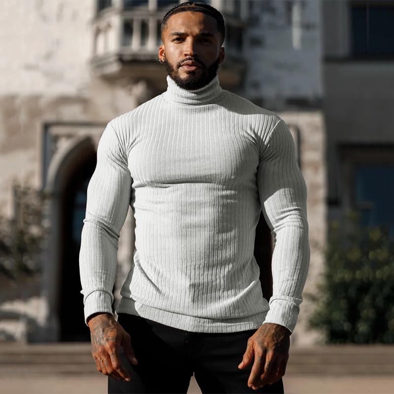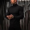 Muscleguys Autumn Ribbed Knit Roll Neck Jumper Mens Running T-shirts Thin Knitted Sports Sweaters Strip Slim Gym Fitness Pullover T Shirts