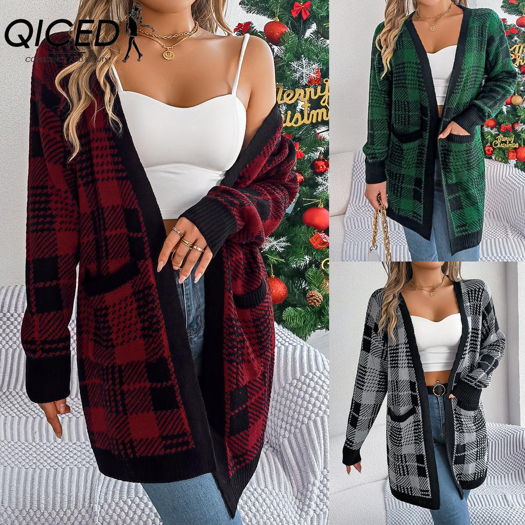 QICED Autumn and Winter Casual Color-blocking Checkered Pocket Long-sleeved Cardigan Sweater Jacket for Christmas Women's Wear
