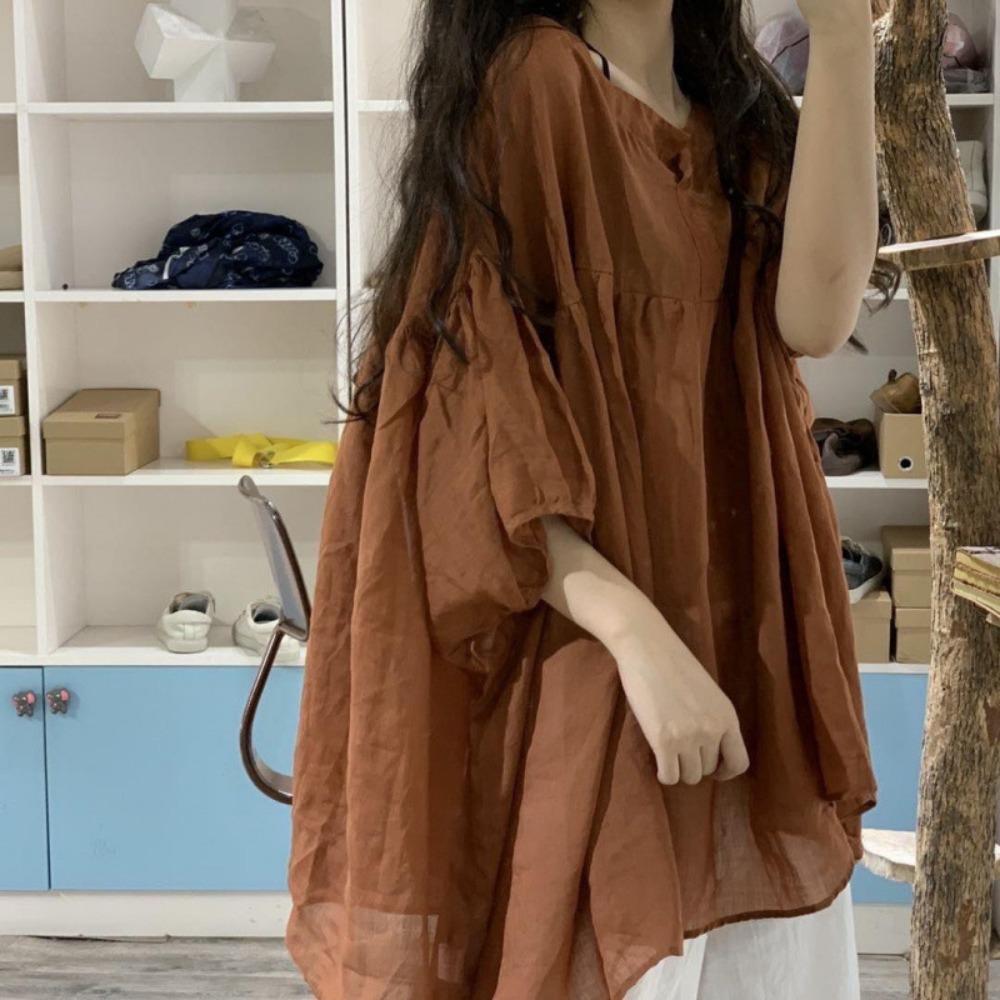 Women's Linen Batwing Blouse - Single Button, Loose Fit, Summer Sun Protection, Fashionable Retro Style