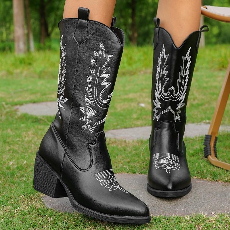 Fashion Women's Mid-calf Boots European American Style Embroidered Pointed Leather Boot Classic Western Cowboy Boots Women Knight Boots