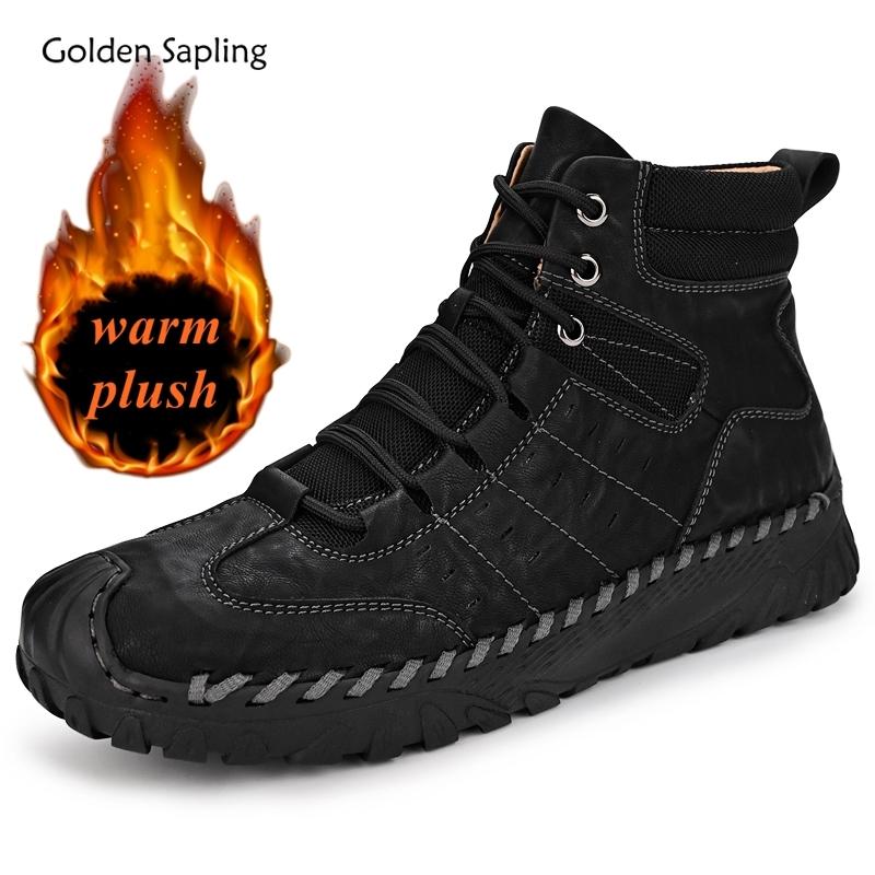 Fashion Golden Sapling Big Size Man Fashion Combat Boots Winter Thicken Warm Plush Men Ankle Boot Flat Shoes Leather Leisure Short Botas