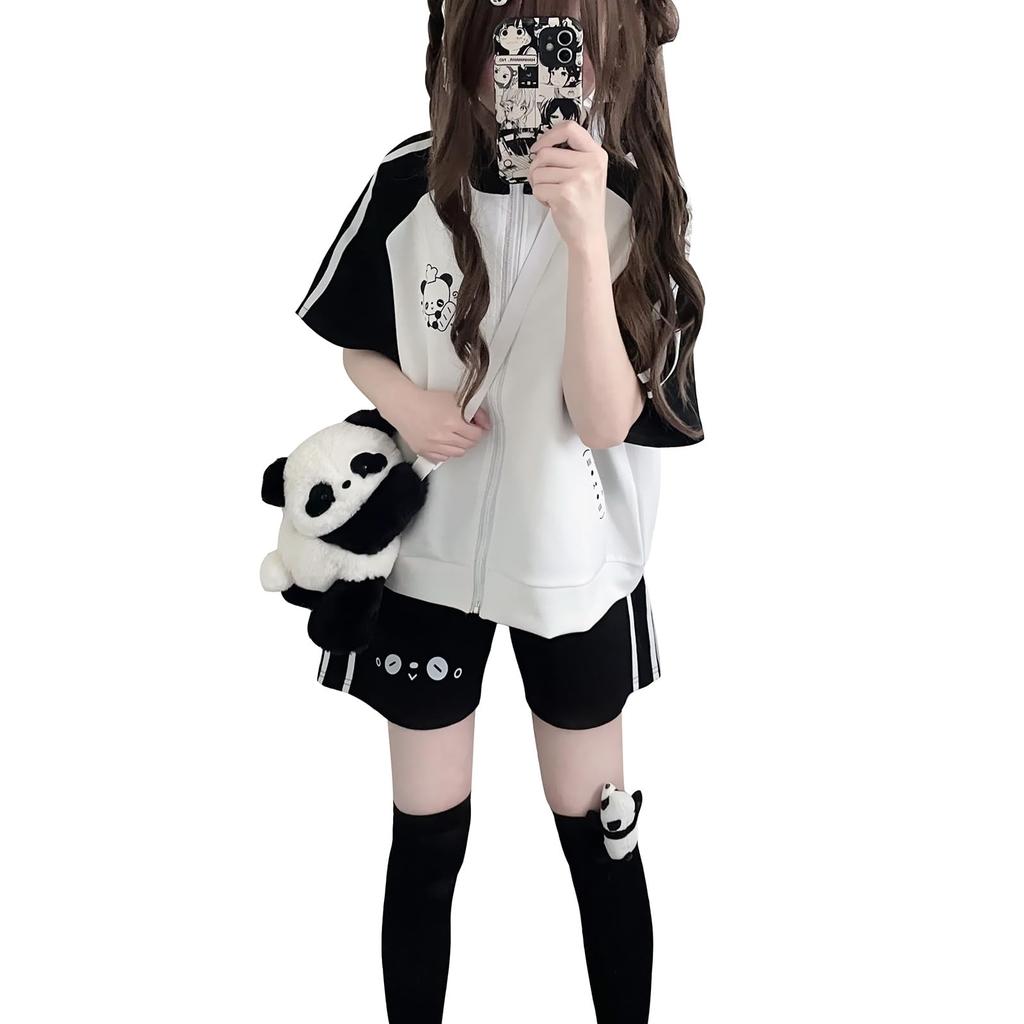 The jacket is a zip-up T-shirt, making it easy to put on and take off. The bottoms are shorts, which give the illusion of longer legs. The waist is elastic, making it easy to move around in and take off. The loose jersey makes it easy to move around in and comfortable to wear without feeling too tight.