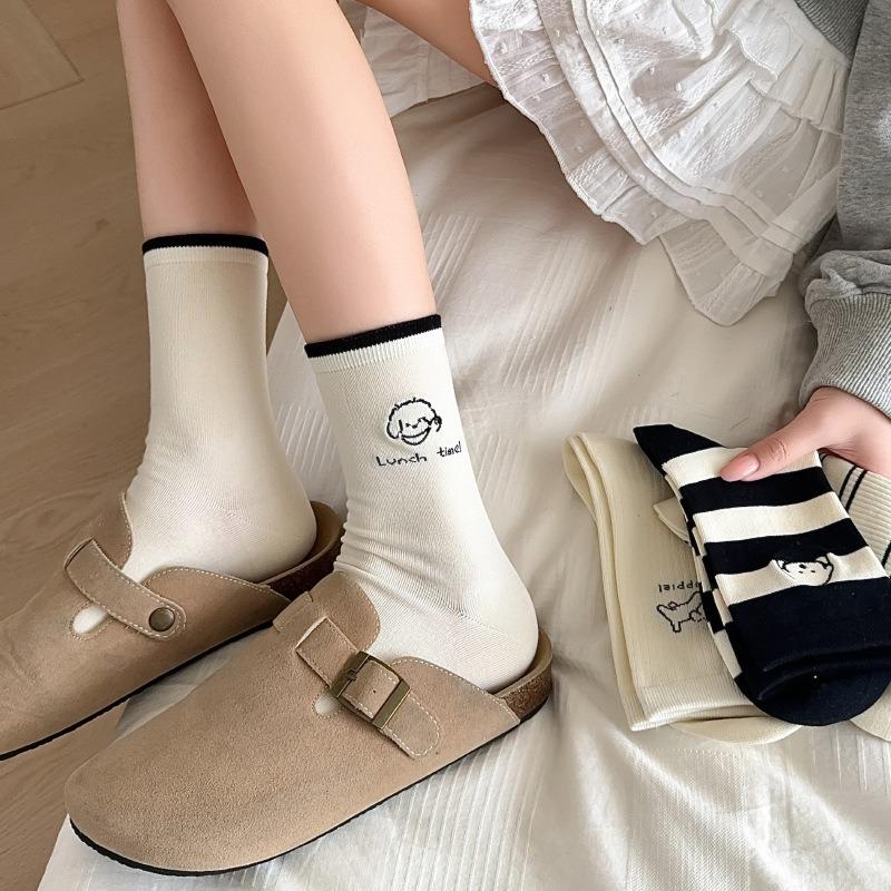 Ladies Summer Stripe Lovely Embroidery Deodorant Sweat Absorber Boneless Breathable Mid Tube Cotton Socks