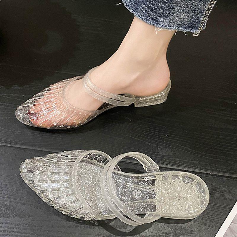 Fashion New Pointed Toe Jelly Sandals Women Chunky Heel Mules Woman Glitter Clear Slip On Hollow Out Low Heel Slides Shoes Lady Sandals