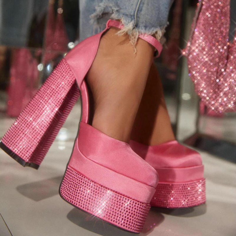 Fashion 2025 New High-Heeled Waterproof Table One-Line Buckle Rhinestone Banquet Ladies Satin Sandals Plus-Size Fashion Runway