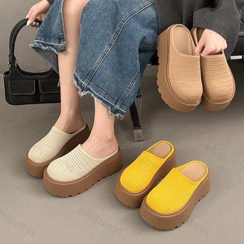 Fashion Women Wedges Slippers 2025 Summer Mesh High Heels Mules Platform Sandals Fashion Dress Outdoor Breathable Heel 7cm Slippers