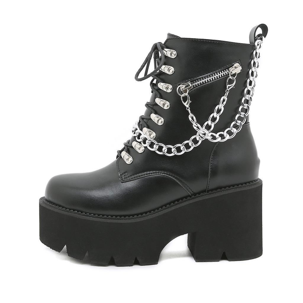 Fashion Gothic Black Boots for Women Sexy Chain Chunky Heel Platform Boots Female Punk Style Ankle Boots Zipper