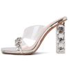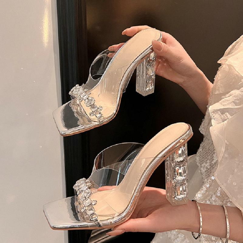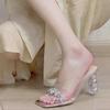 Fashion Pvc Transparent Crystal High Heels, Sexy Rhinestone Sandals, Thick-Heeled Fairy Square Toe Flip-Flops Worn Outside