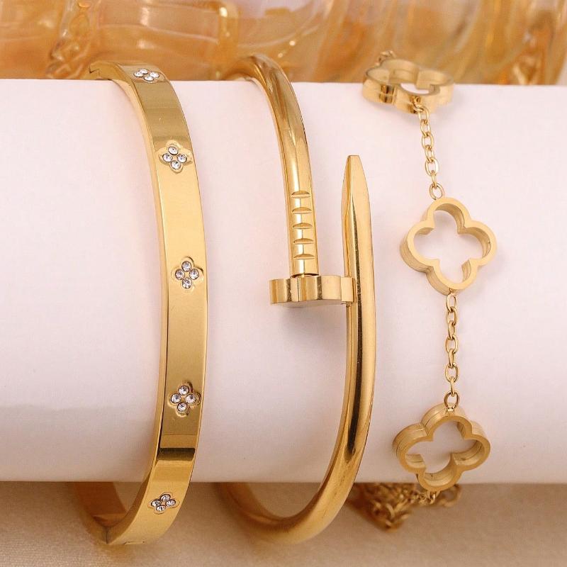 3pcs Fashion Luxury Clover Zirconia Inlaid Stainless Steel Bangle Bracelet, Versatile For Daily Wear