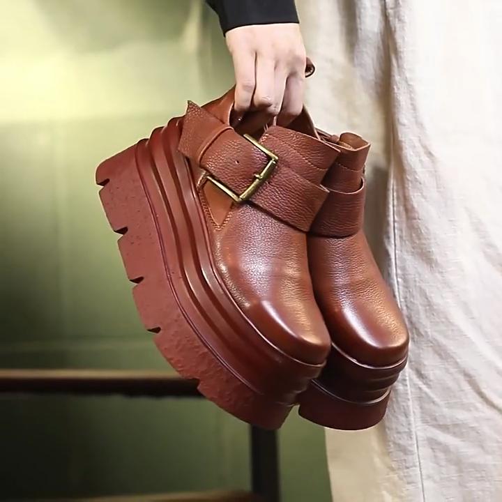Johnature Platform Shoes Vintage Genuine Leather High Heels Women's Shoes Lightweight Height Increasing Shoes