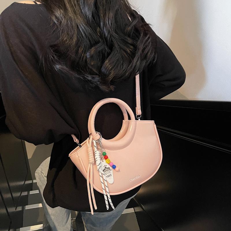 Playful-Sleek Appearance Details: This bag features a unique curved silhouette with a circular top handle and an optional colorful accessory, adding a touch of fun and modern charm. The varied color options, with or without accessory, make it a versatile fashion piece for those who love trendy styles.