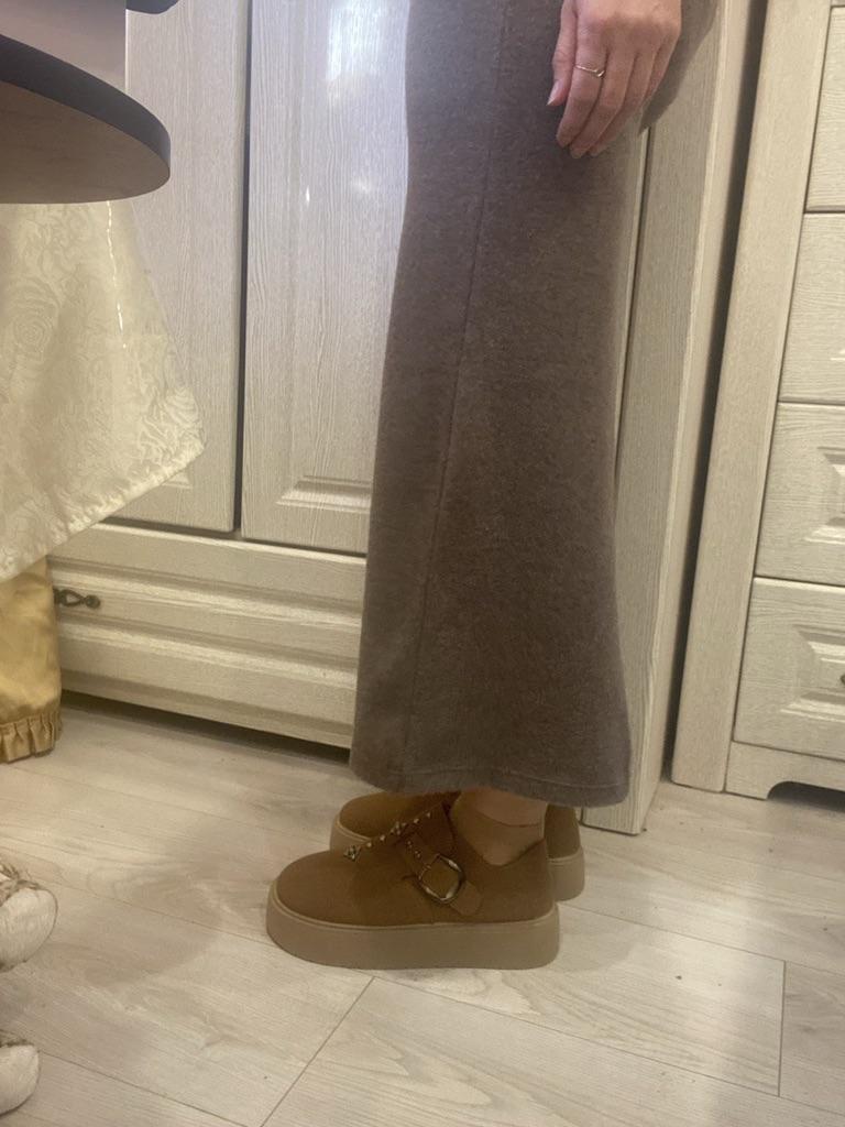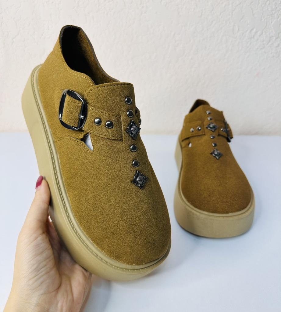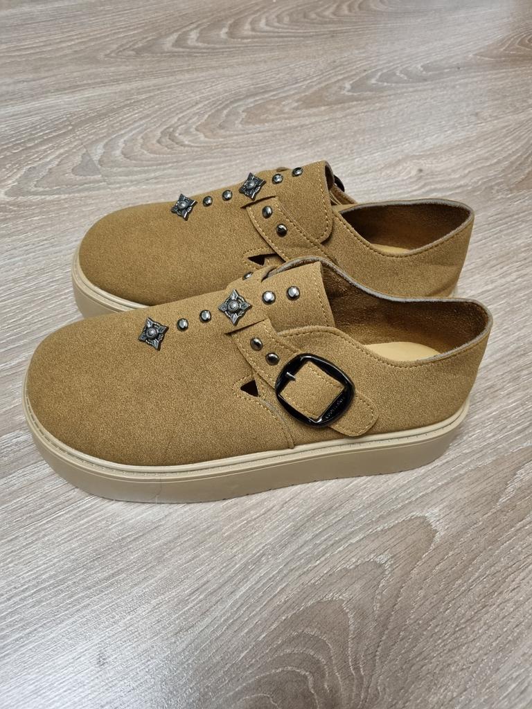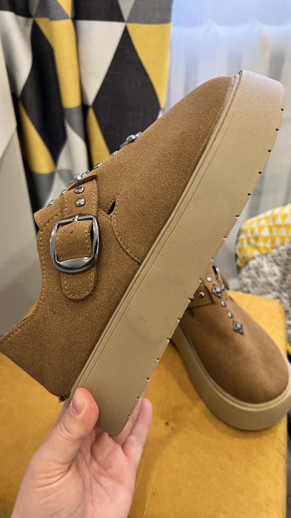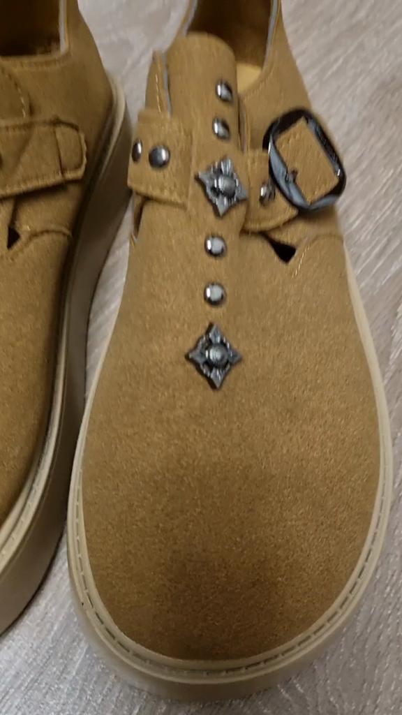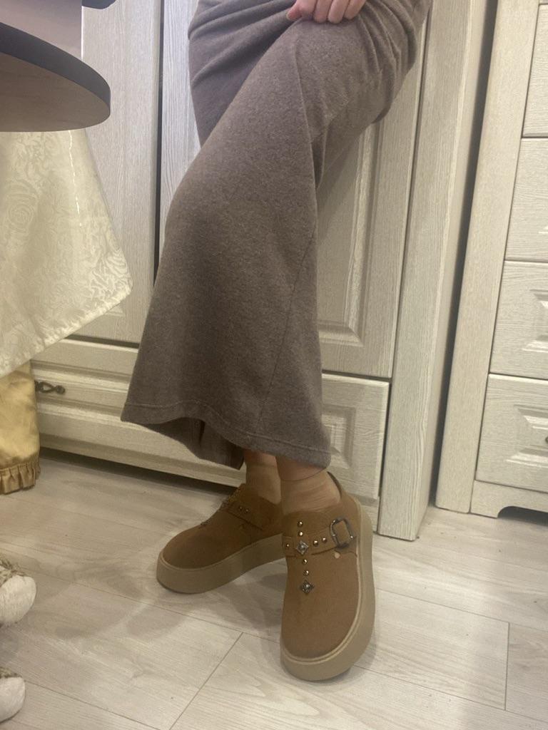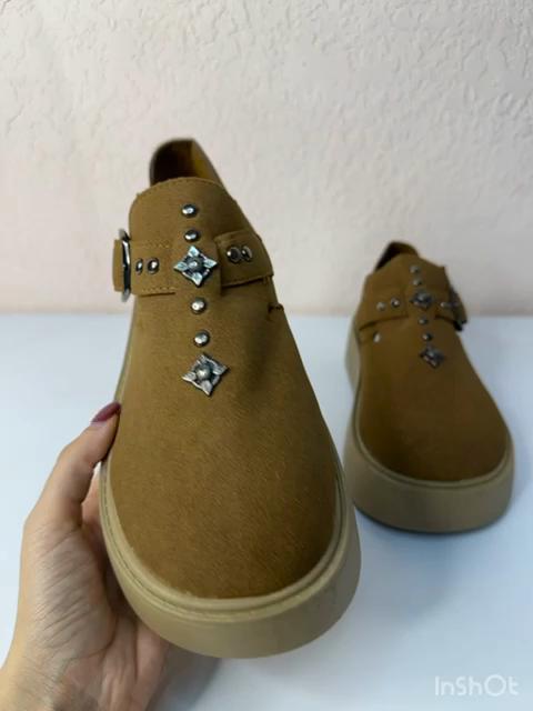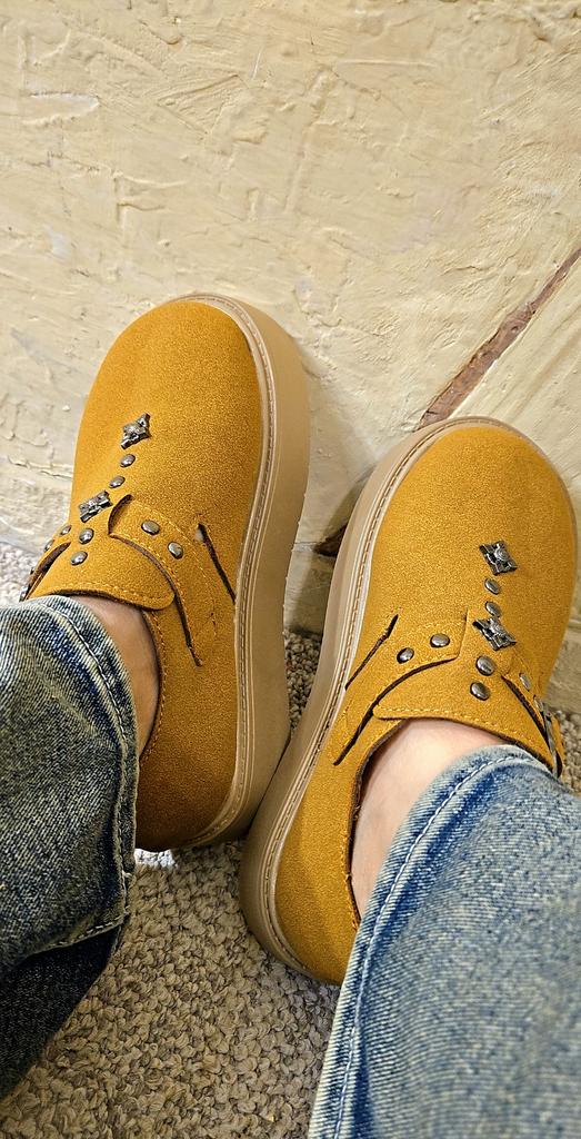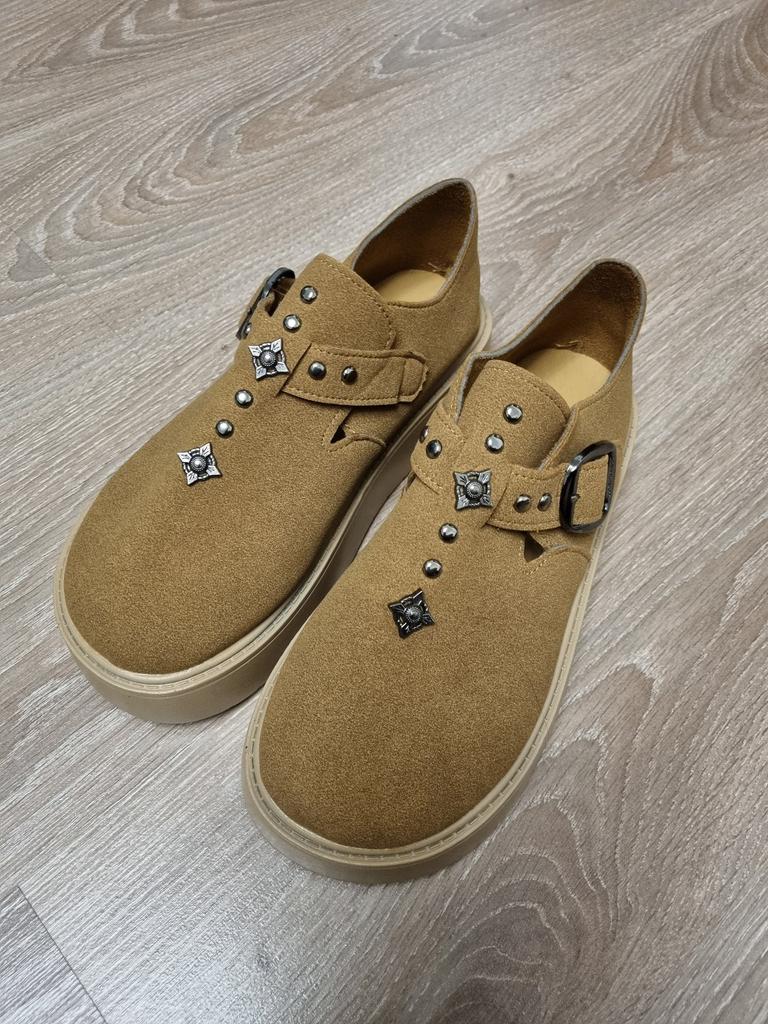 Stylish suede shoes🧡 Made of material similar to natural suede, of good quality. Odorless and without glue residue, hold their shape well. The beautiful mustard color goes perfectly with the color of the sole. Lightweight, comfortable, on a small platform. Interesting hardware in dark silver. The foot is comfortable inside)) Under jeans, knitted trousers will look very fashionable. For a foot length of 23.5, size 37 fit well, slightly loose. They will also fit a wide foot.. I showed everything in detail on the video! I recommend it from the bottom of my heart🧡