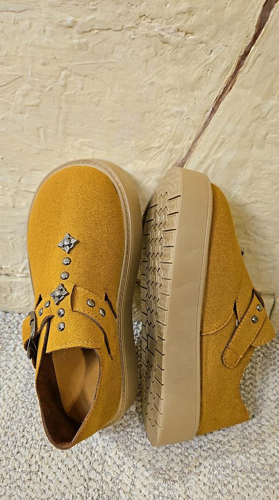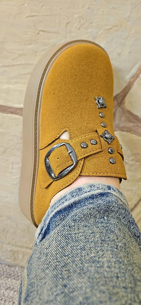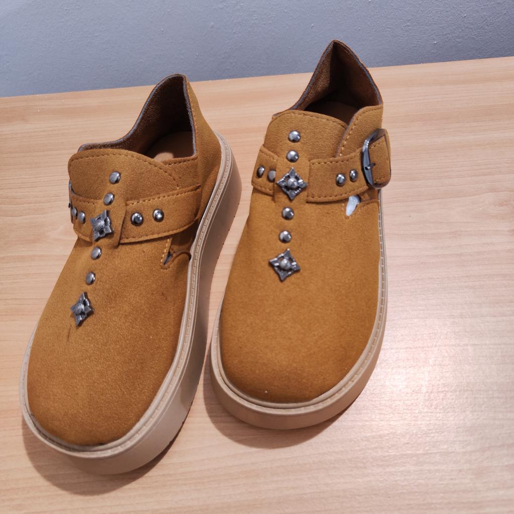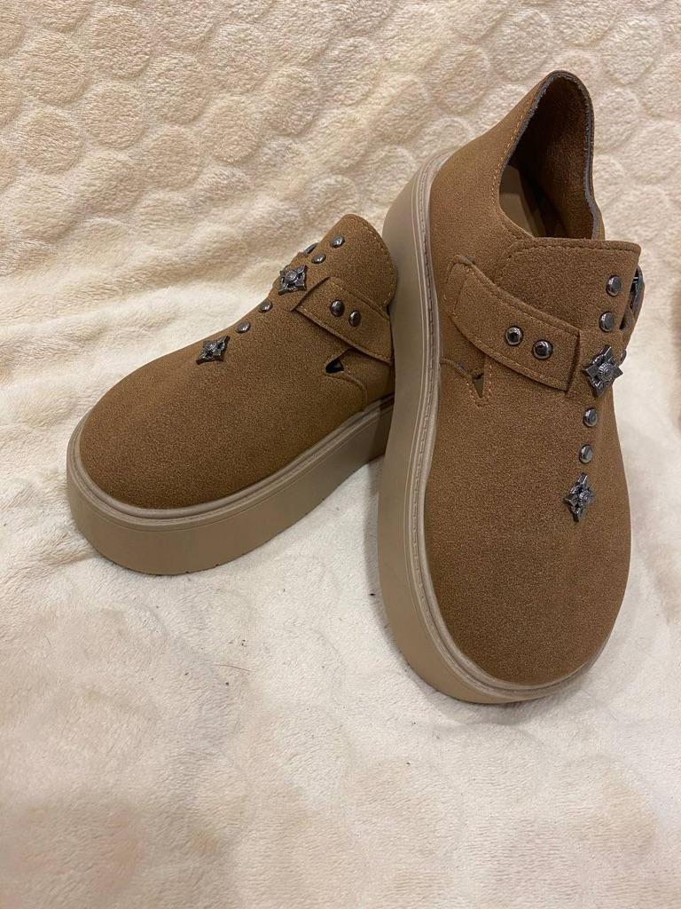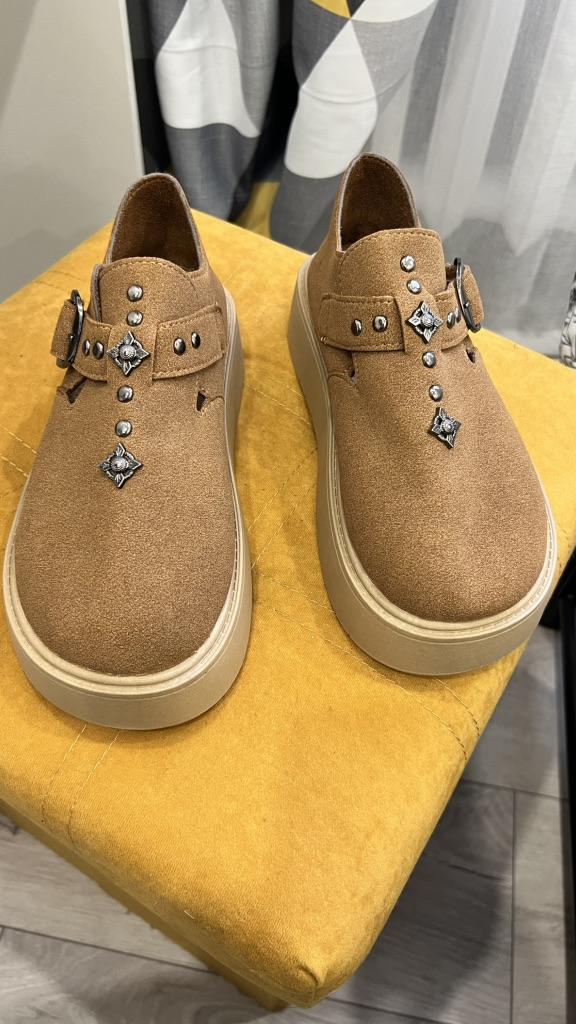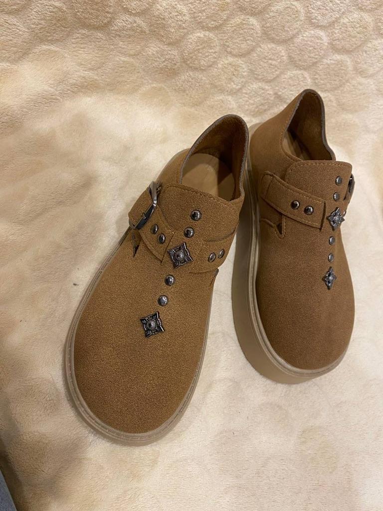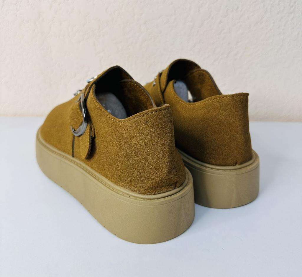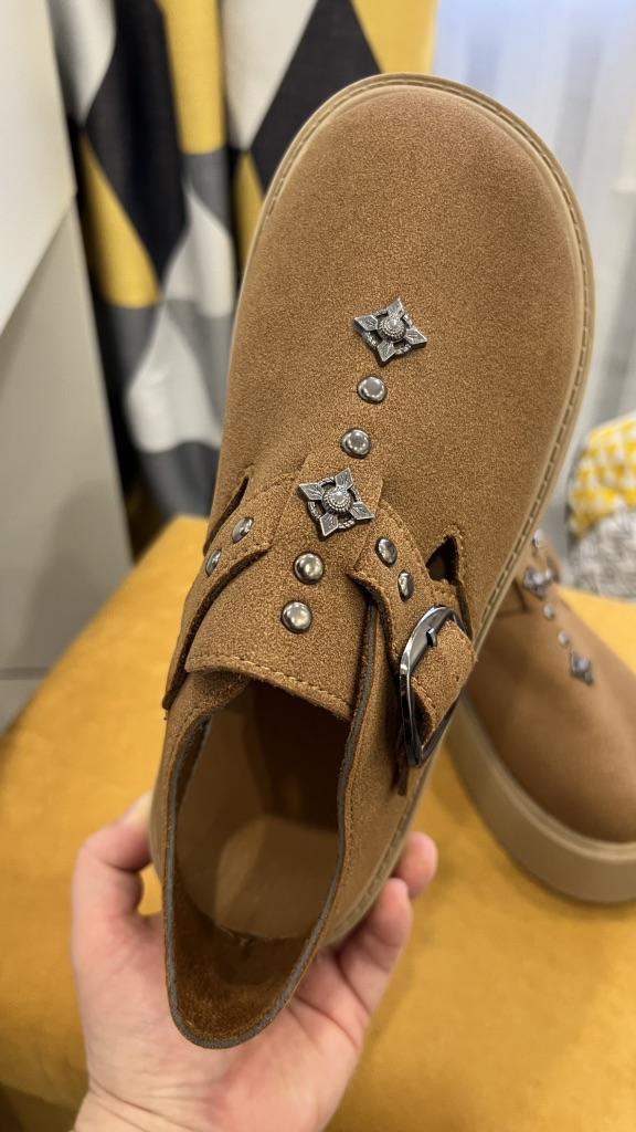 Stylish suede shoes🧡 Made of material similar to natural suede, of good quality. Odorless and without glue residue, hold their shape well. The beautiful mustard color goes perfectly with the color of the sole. Lightweight, comfortable, on a small platform. Interesting hardware in dark silver. The foot is comfortable inside)) Under jeans, knitted trousers will look very fashionable. For a foot length of 23.5, size 37 fit well, slightly loose. They will also fit a wide foot.. I showed everything in detail on the video! I recommend it from the bottom of my heart🧡