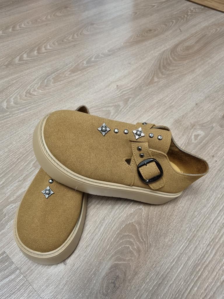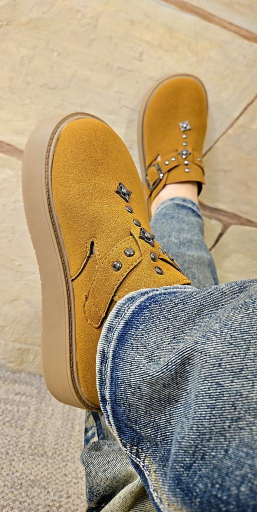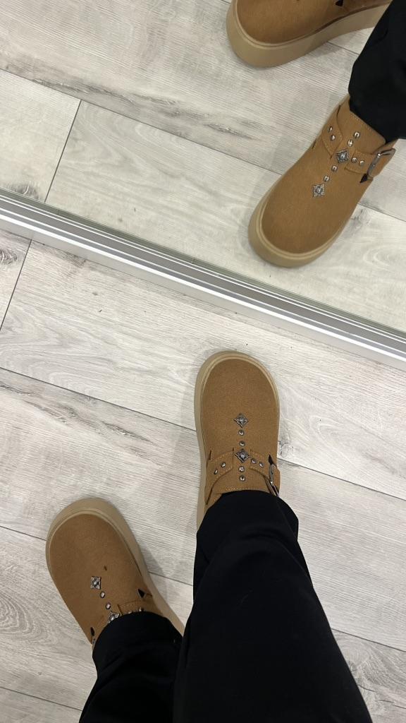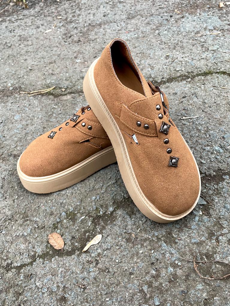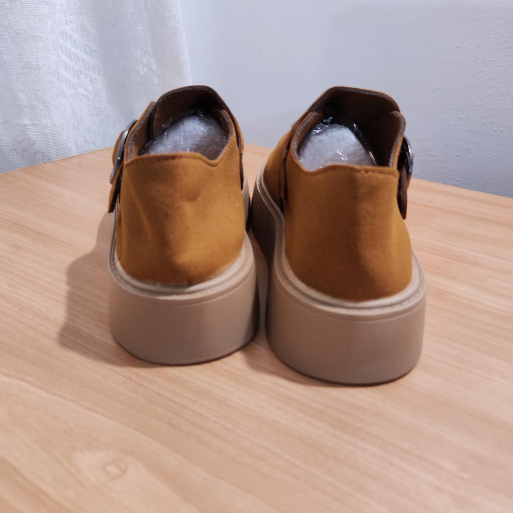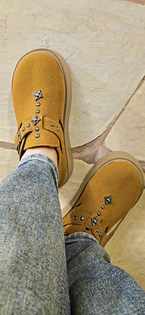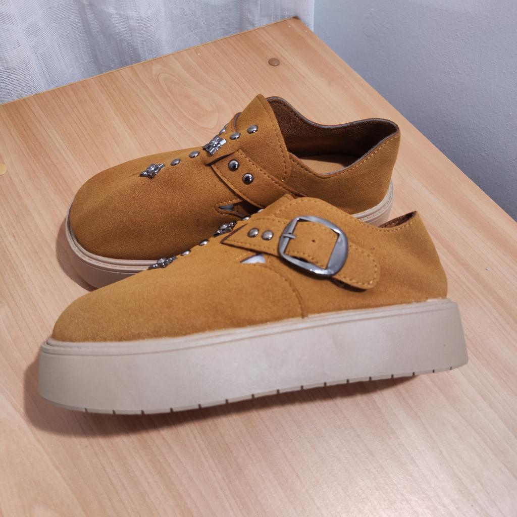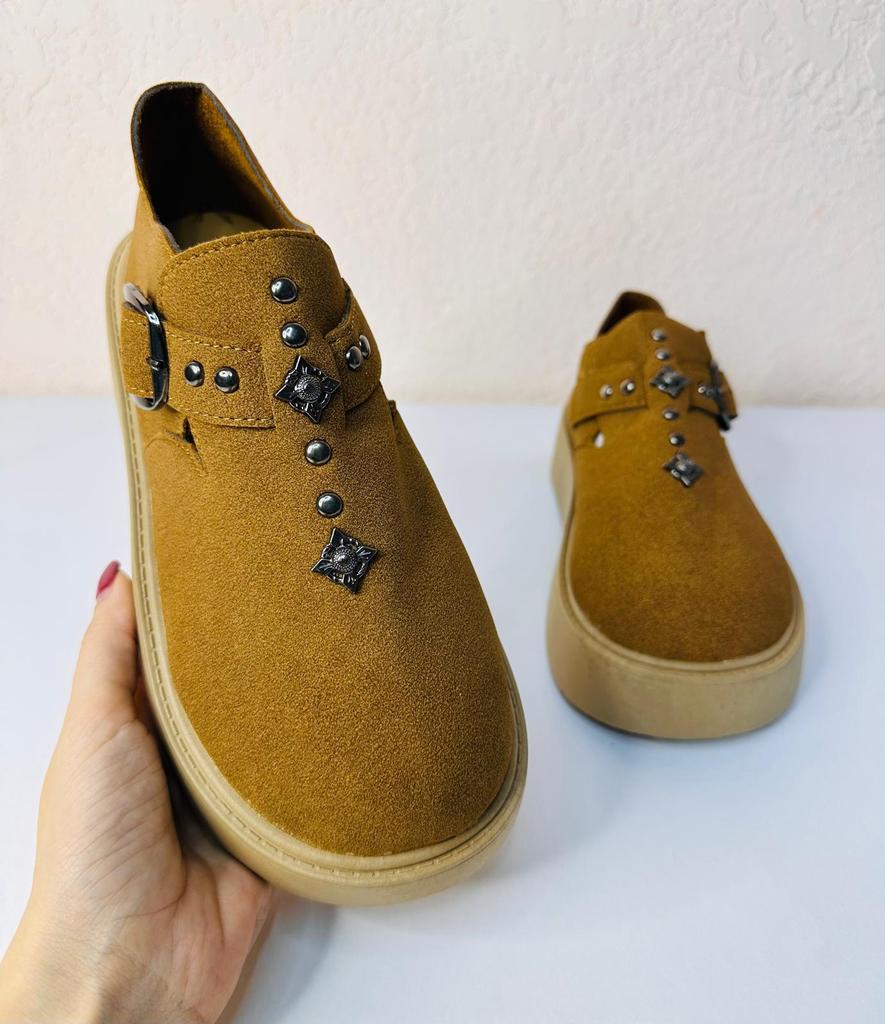 Stylish suede shoes🧡 Made of material similar to natural suede, of good quality. Odorless and without glue residue, hold their shape well. The beautiful mustard color goes perfectly with the color of the sole. Lightweight, comfortable, on a small platform. Interesting hardware in dark silver. The foot is comfortable inside)) Under jeans, knitted trousers will look very fashionable. For a foot length of 23.5, size 37 fit well, slightly loose. They will also fit a wide foot.. I showed everything in detail on the video! I recommend it from the bottom of my heart🧡