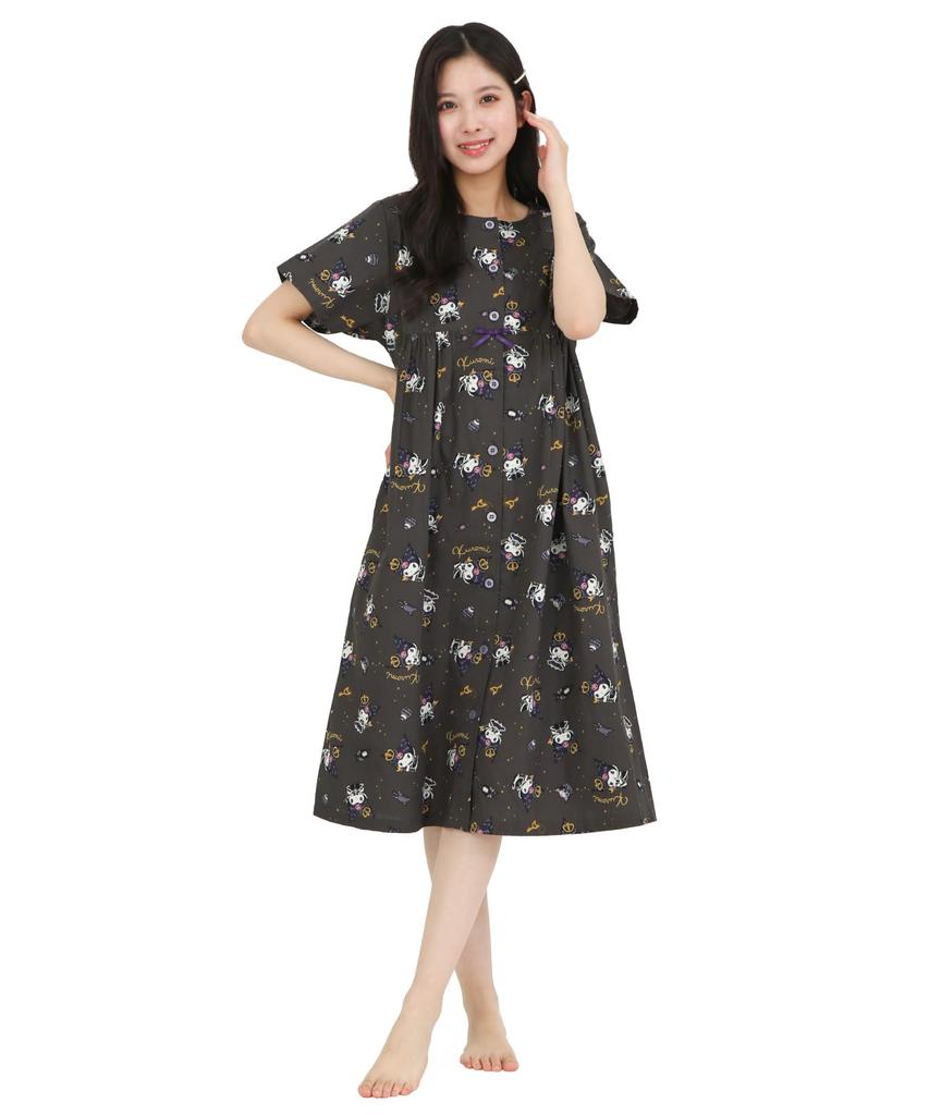 SAZAC Kuromi Cotton Loungewear Dress, 100% Broadcloth, Button-Front, Women's Nightgown, (Black/M-L/SAN1903)