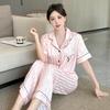 Indulge in luxurious comfort with this elegant pajama set, crafted from soft artificial silk material. Designed with a stylish striped jacquard pattern, these pajamas offer a refined look for relaxing at home. The long sleeve top ensures warmth and coziness, while the breathable ice silk fabric provides a cool and silky feel against your skin, perfect for year-round wear. Enjoy a blend of sophistication and relaxation with this beautifully crafted set.