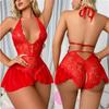 Sexy Crotchless Lingerie Women Lace Hollow Bodysuit Erotic Pajamas Teddy Babydoll Dress Deep V Open Bra Underwear Set