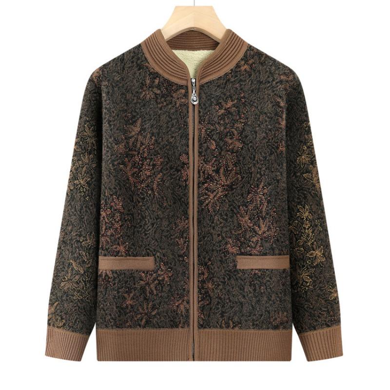 Middle-aged Grandma Pack Fleece Thickened Cardigan Knitted Sweater Mother's New Warm Flower Top Old Man Sweater New