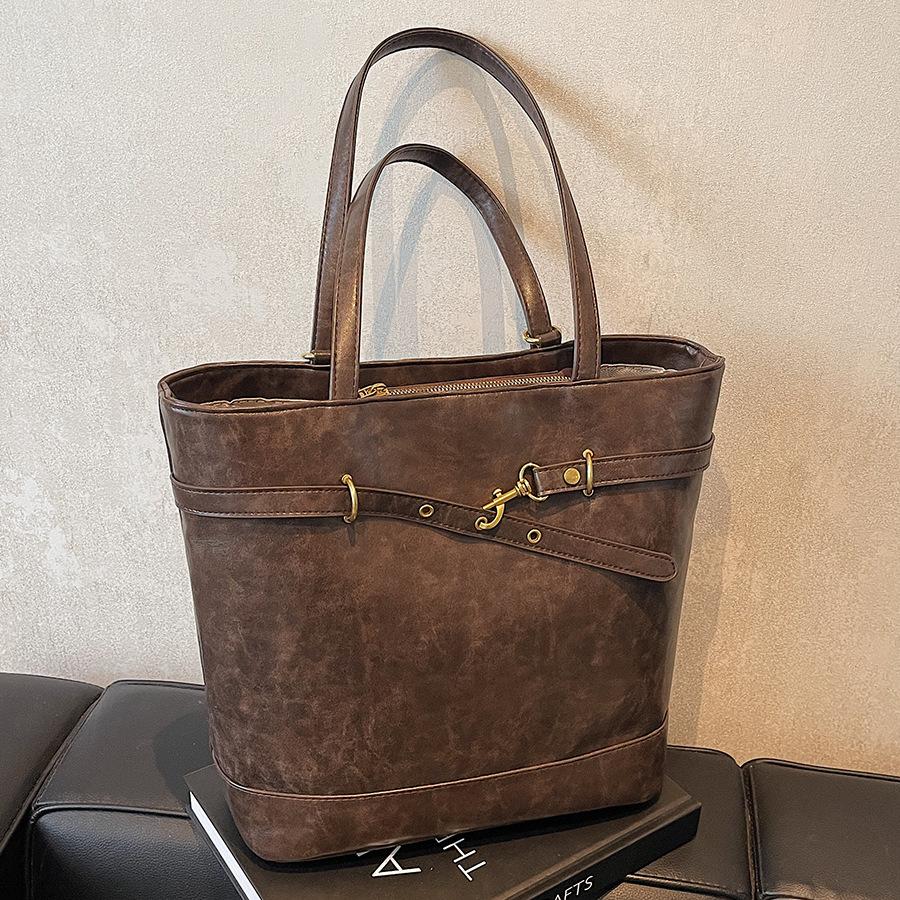 - **Structured Tote Bag Details**: Features a sleek structured tote silhouette with vintage-textured PU finish, metal buckle details, multiple carrying options (handheld, single-shoulder, backpack), and a spacious interior, exuding retro and versatile charm. Three color options cater to diverse style preferences.