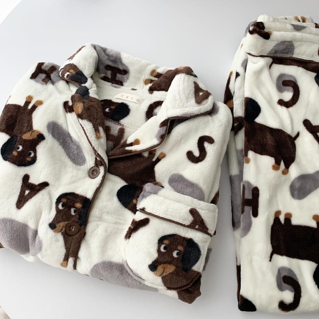 Fall Winter Women's Pajamas Cute Dachshund Print Fleece Thick Two Pieces Set Nightgown Lounge Long Sleeve Pants