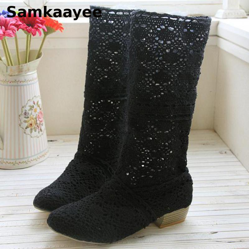Lable: yes34-43 Women Hollow Boots Breathable Shoes Summer Female Knee High Botas Mesh Knit Line Flats Slip-On Solid Color Ankle Footwear