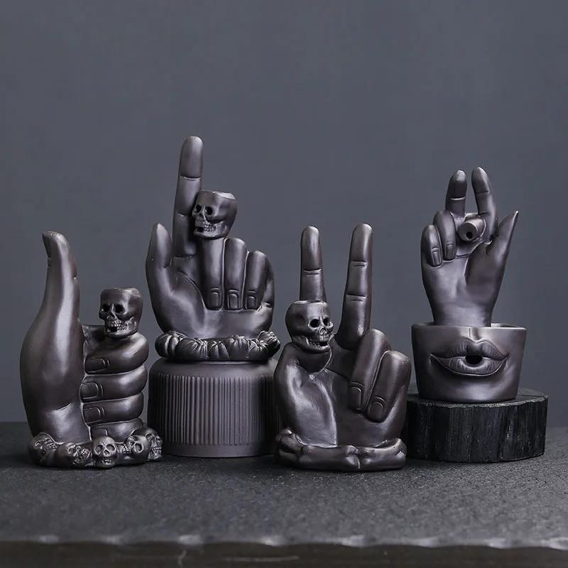 1pc Purple Clay Backflow Incense Burner, Creative Skull & Hand Design, Halloween Home Decor (Without Incense)