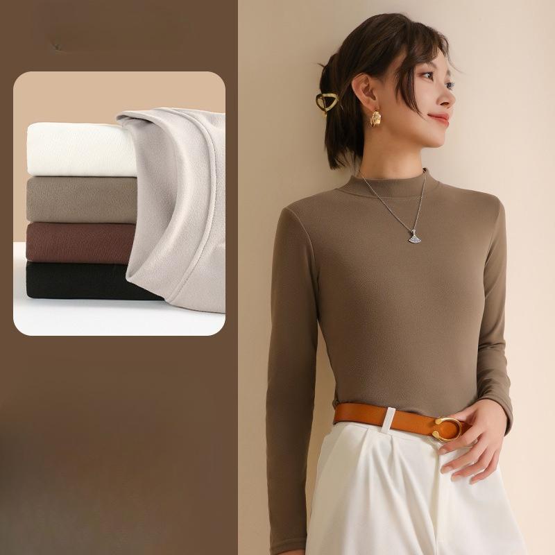 Women's Half-High Neck Double-Sided German Fleece Solid Long Sleeve Top Fashionable Inner Wear Medium Neck Base Layer for Spring, Autumn and Winter