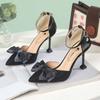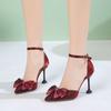 Thin Heel Pointed High Heels Women's Burgundy Bow Wedding Shoes Versatile Cat Heel Single Shoes One-word Buckle Belt Hollow Sandals