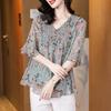 V-Neck Half Sleeve Printed Shirt Spring Summer Korean Female Clothing Spliced Chic Three-dimensional Decoration Blouse