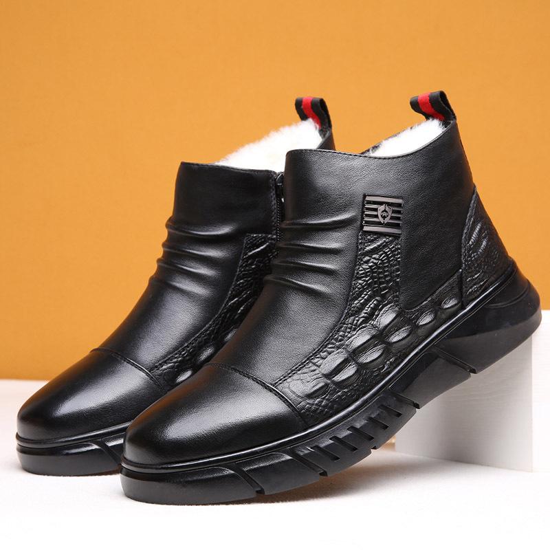 Leather Men's Shoes Winter Velvet Warm High-top Leather Shoes Crocodile Pattern Kuaishou Casual Shoes Men's Internet Celebrities Men's Cotton Shoes