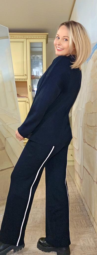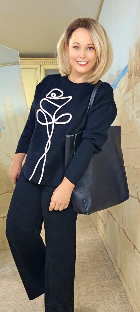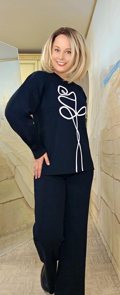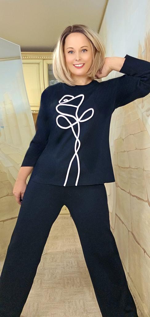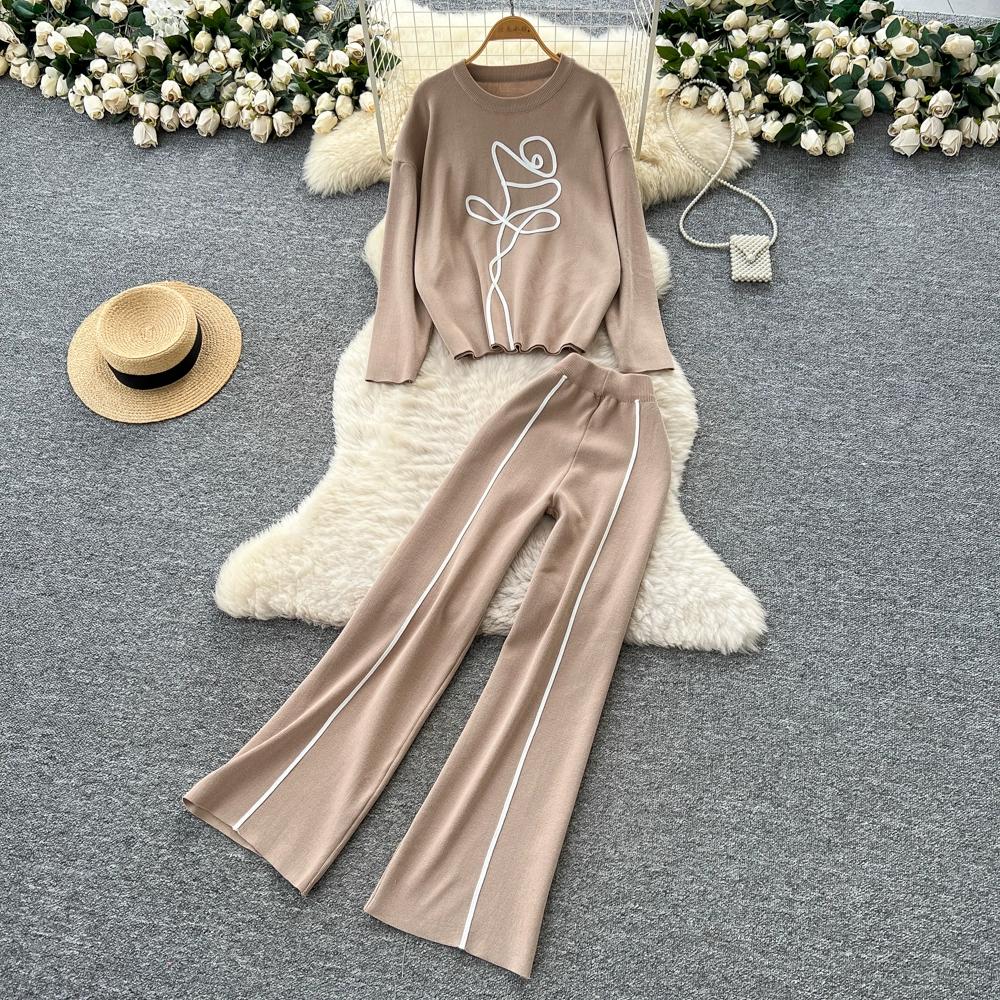 Autumn Winter Women Casual Knitted Sweater Trouser Two Piece Set Full Sleeve Flower Pullover Tops and Wide Leg Pant Tracksuit
