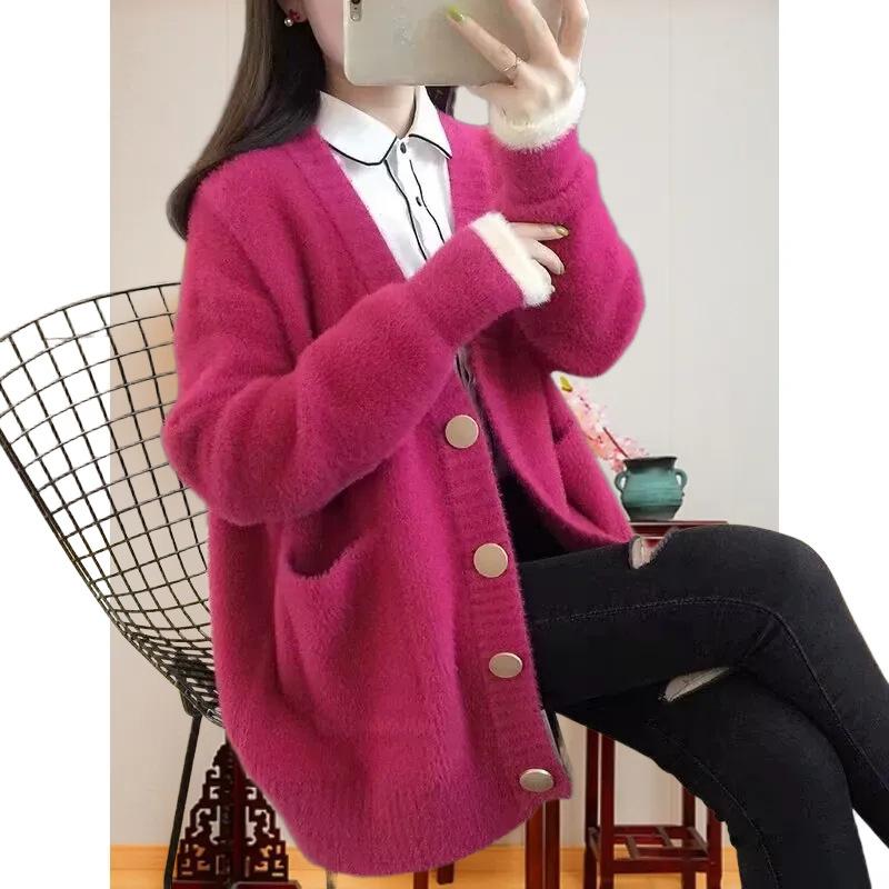 Fashion Casual Loose Imitation Mink Sweater Women's Autumn and Winter Temperament Elegant Wind Pocket Knitted Sweater Top Coat