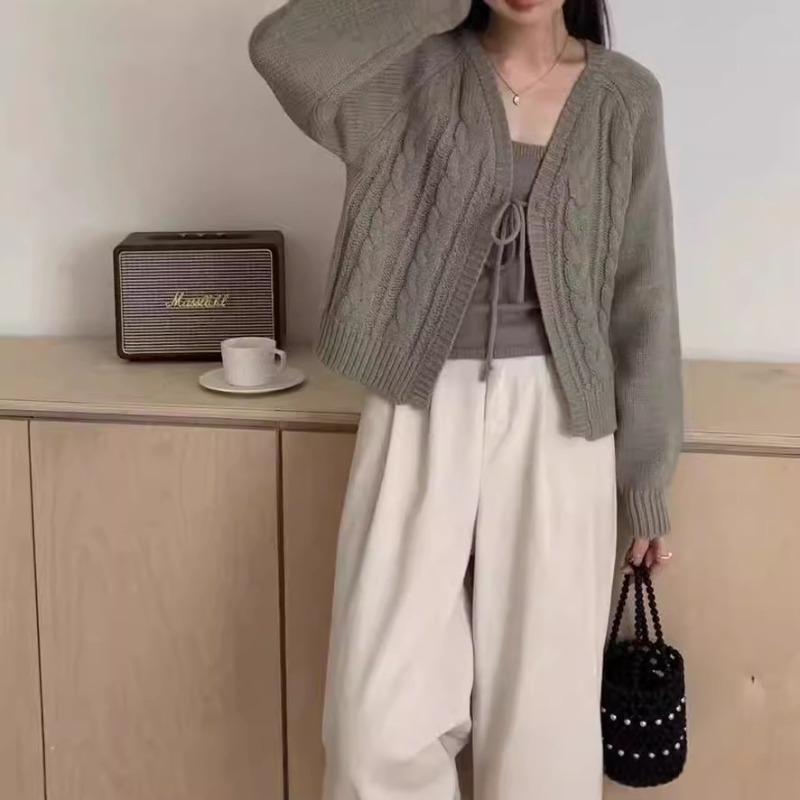 Knitted Cardigan Jacket New Soft Waxy Short Sweater Top Versatile Round Neck Lace-up Twist Shawl Two-piece Set Women