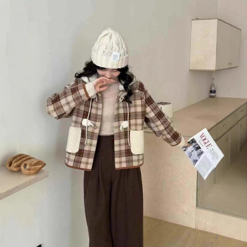 Removable Hat Plaid Woolen Jacket Women's Short Autumn and Winter Loose New Woolen Coat Plaid Thickened Sweater