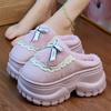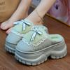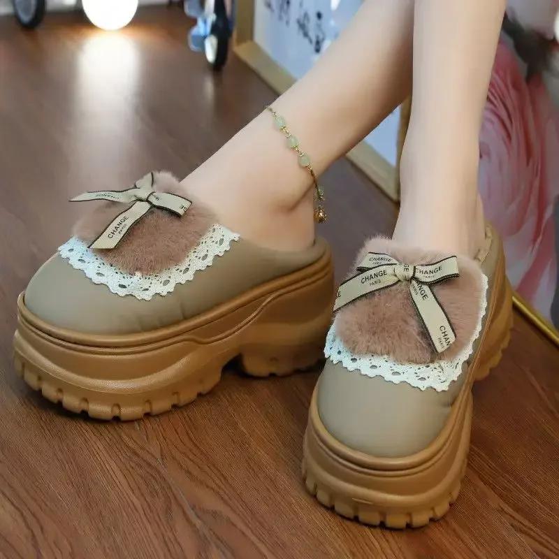 Fashion Winter Furry Women Waterproof Mules Cotton Slippers Girl Bow Tied Furry Slippers Home Platform Warm Slippers Ladies