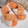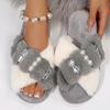 Fashion Pearls Crystal Plush Slippers Women Fashion Cross Band Slip On Cotton Slippers Woman Winter Faux Fur Warm Slides Female Comfort