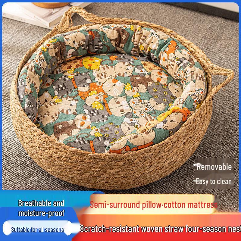 Four Seasons Rattan Cat Nest: Cozy Straw-Weaved Bed for Cats & Small Dogs