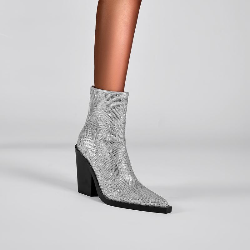 Fashion Kaky's New Pointed Rhinestone Thick High Heels Large Women's Boots Short Boots Western Boots