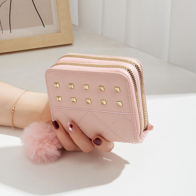 New Women's Wallet Clutch Bag, Short Change Bag, Diamond Rivet Hairball Decorative Card Bag, One Piece.