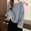 Lazy Wind Long-sleeved Loose and Thin Top Women's Diamond-encrusted Round Neck Pullover Solid Color Simple Knitted Sweater