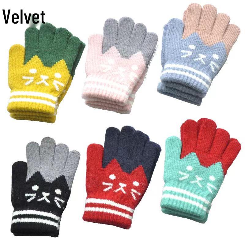 Kids' Winter Fleece-lined Cold-proof Gloves for Elementary Students – Boys' and Girls' Kitten Jacquard Design