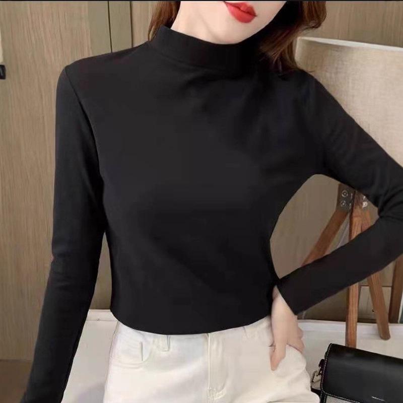 Elevate your autumn and winter wardrobe with this sleek and stylish women's T-shirt, designed with a half high neck for a touch of elegance. The slim fit accentuates your figure while providing comfort and warmth. Featuring long sleeves, this T-shirt is crafted from high-quality polyester material, ensuring durability and a cozy feel. Its solid color design makes it a versatile piece, easily paired with any outfit for a chic and polished look. Whether you're heading out for a casual outing or layering up on a chilly day, this T-shirt is the perfect addition to your seasonal collection.