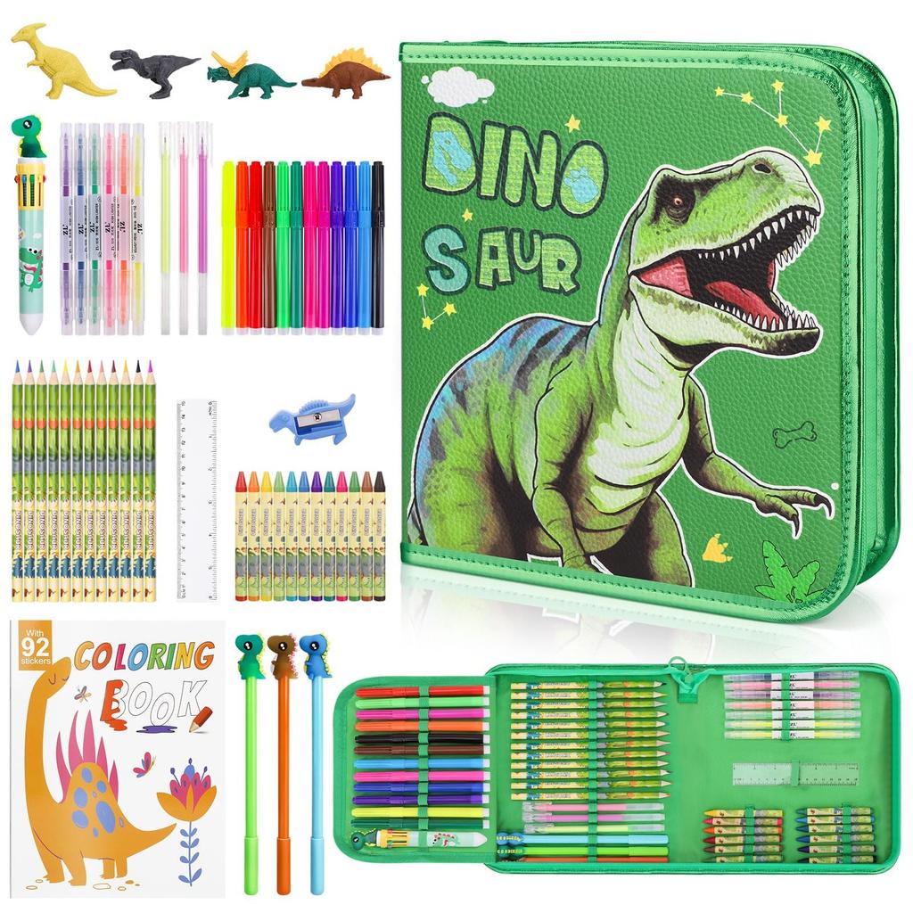 Dinosaur Themed Art Set: Not only does it come with a cool dinosaur-patterned pencil case, but it also includes colorful pens, pencils, erasers and a coloring book, all of which are dinosaur-themed, making it the perfect gift for any dinosaur-loving child.