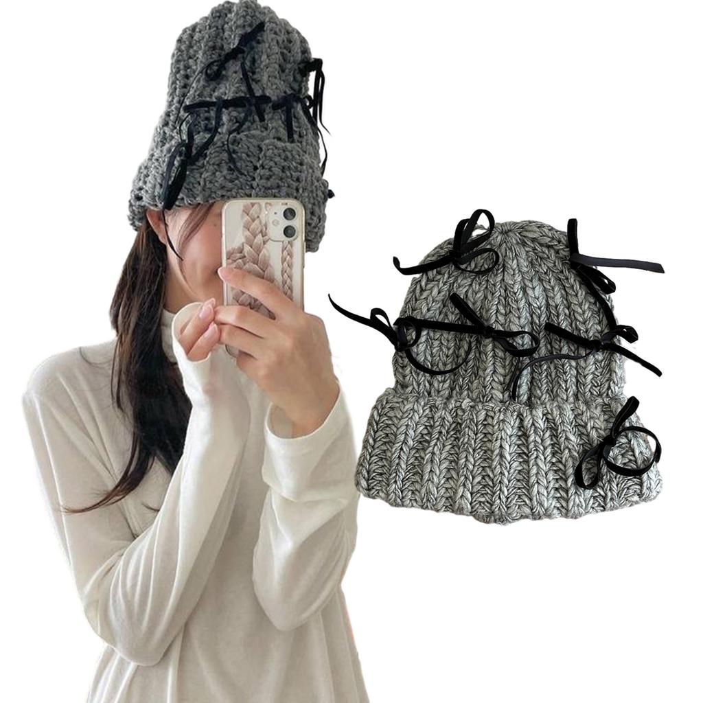 Delicate Velvet Bowknot Beanie Adult Elastic Hat Winter Warmer Knitted Hat Cold Winter Presents for Students Teenagers