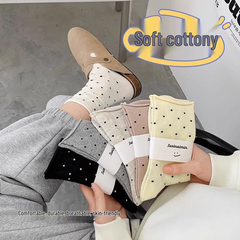 Women's Polka Dot Mid-Calf Socks - Spring To Autumn, Trendy Korean Style, Thin Sports Design with Rolled Edge.