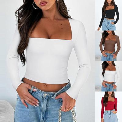 Spring Autumn Square Collar Solid Color Slim T-shirt Women Long Sleeve Y2K Elastic Bottomed Tee Pullover Top