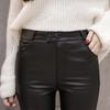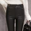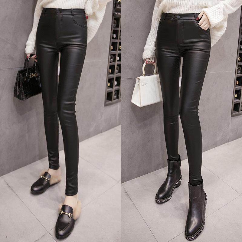 These stylish leggings offer a sleek and modern look with their skinny fit and matte finish. Lined with soft fleece, they provide warmth and comfort, making them perfect for cooler weather. Crafted from high-quality faux leather, they boast a solid pattern that adds sophistication to any outfit. Choose between single or double button closure for a customized fit. Perfect for adding a touch of Korean style to your wardrobe, these leggings effortlessly blend fashion and functionality.