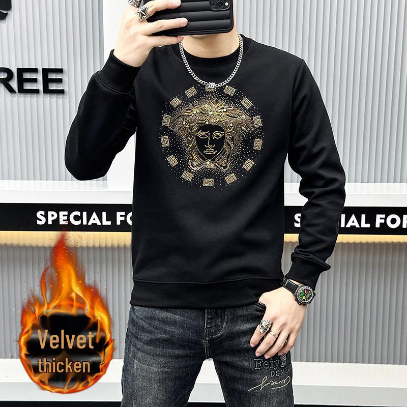 This men's sweatshirt combines European luxury with modern street style, featuring a unique hot drill design. It's crafted from premium cotton material, ensuring both comfort and durability. The interior is lined with soft cotton fur, providing a cozy, warm feel suitable for cooler weather. With a trendy stand neckline and long sleeves, this loose-fit sweatshirt offers a fashionable and relaxed look. Perfect for those seeking a comfortable yet chic outerwear option, its solid pattern adds versatility, making it an ideal staple for any wardrobe.