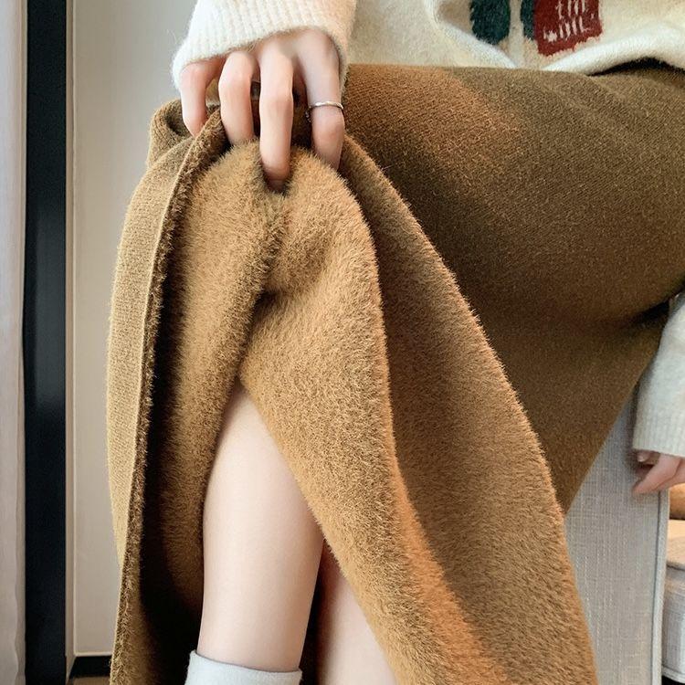 Winter Fleece Lined High Waist Thick Knit Long Skirt with Slit Straight Tube